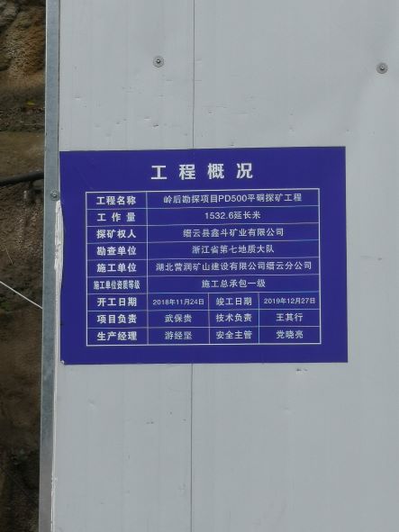 縉云縣鑫斗礦業有限公司是一家有限責任公司,成立于2007年8月7日,法定代表人:張圣,經營范圍:螢石(普通)地下開采;螢石礦勘探;螢石及螢石工藝品加工、銷售。 礦山新建項目名稱為浙江省縉云縣大源鎮嶺后螢石礦,擬建生產規模15萬噸/年。該礦山項目探礦權于2005年9月首次設立,委托浙江省第七地質大隊組織實施。最新核發的探礦權證有效期限為2020年05月26日至2022年05月26日,勘查范圍由22個拐點組成。