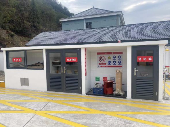 2、卸油臺更換為中石化標(biāo)準(zhǔn)卸油消防應(yīng)急器材箱,位于罐區(qū)東面。