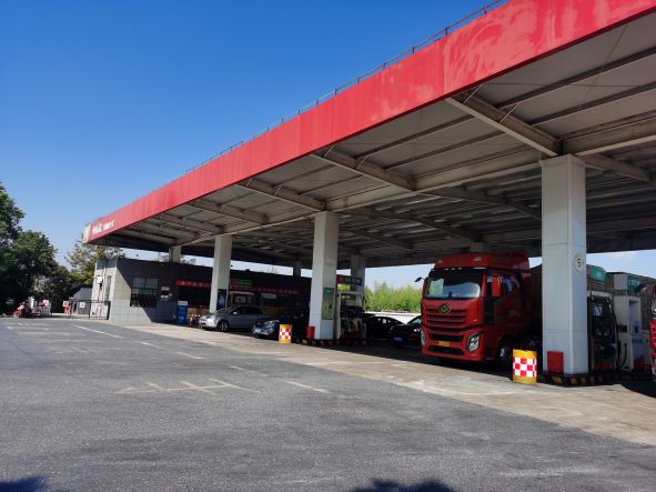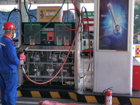 加油區設置加油罩棚,罩棚下設置3臺雙油品四槍潛泵式加油機和3臺三油品六槍潛泵式加油機;埋地罐區設有6只SF雙層埋地油罐,其中30m3汽油罐4只(92#2只、95#1只、98#1只)、30m3柴油罐2只(0#),折算后油罐總容積150m3(柴油罐折半計入),依據《汽車加油加氣加氫站技術標準》GB50156-2021第3.0.9條辨識,該站屬于二級加油站。加油站已安裝汽油卸油和加油油氣回收系統。